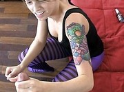 Sizzling hot chick wrapping her pantyhose clad feet...